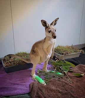 A juvenile western grey kangaroo recovers from minor burns at a hospital in Perth, Australia, following a wildfire in 2021.